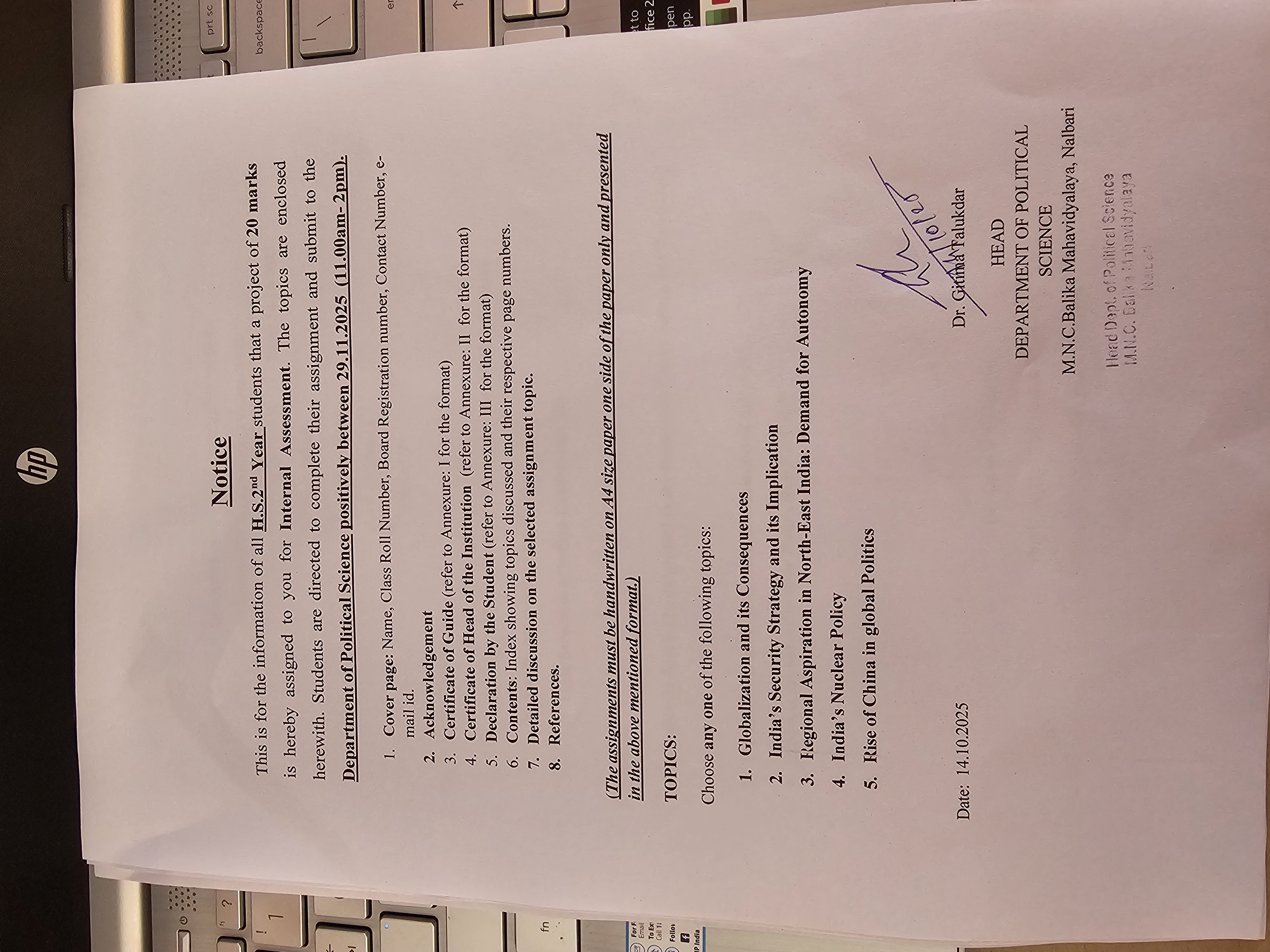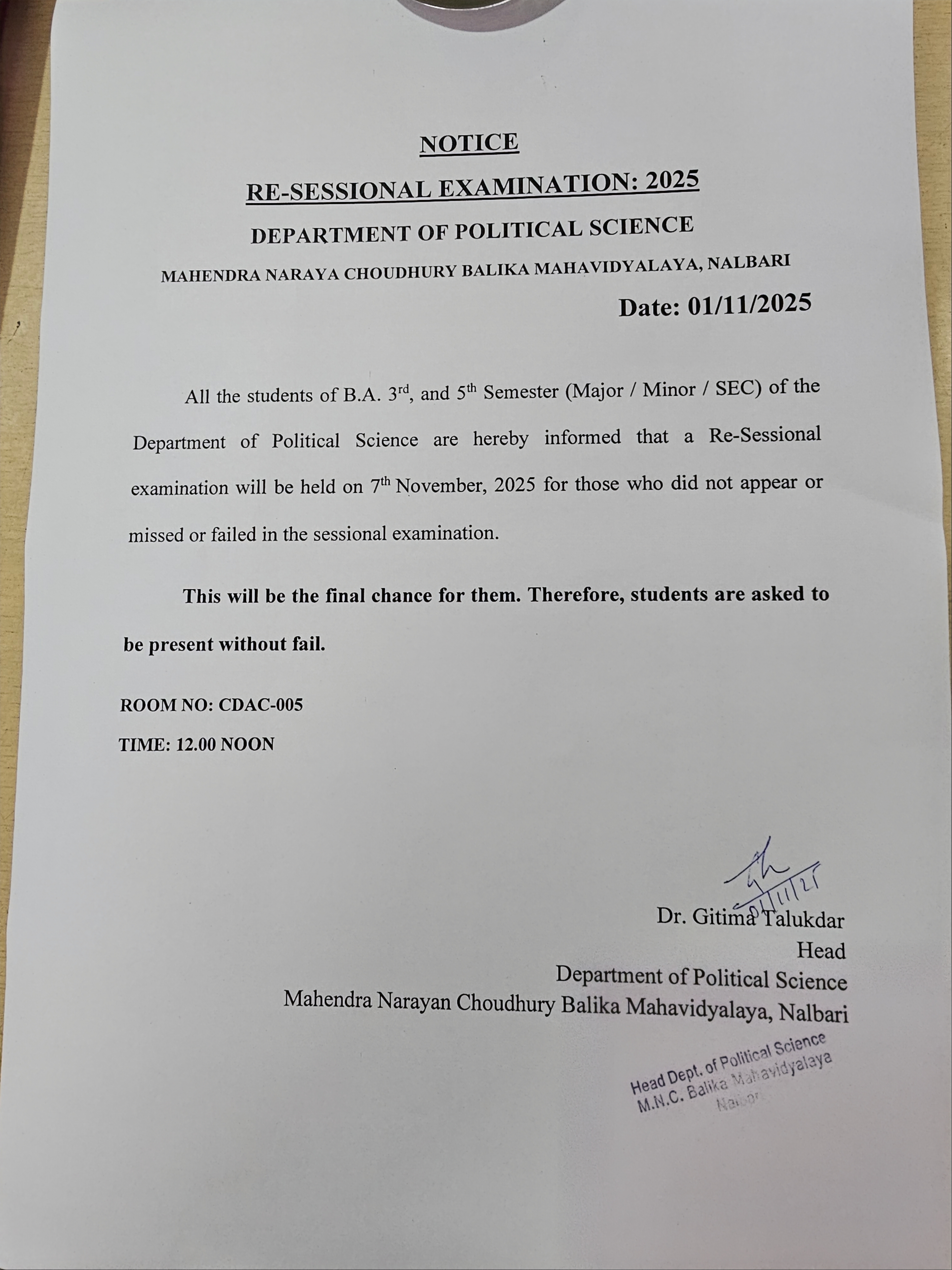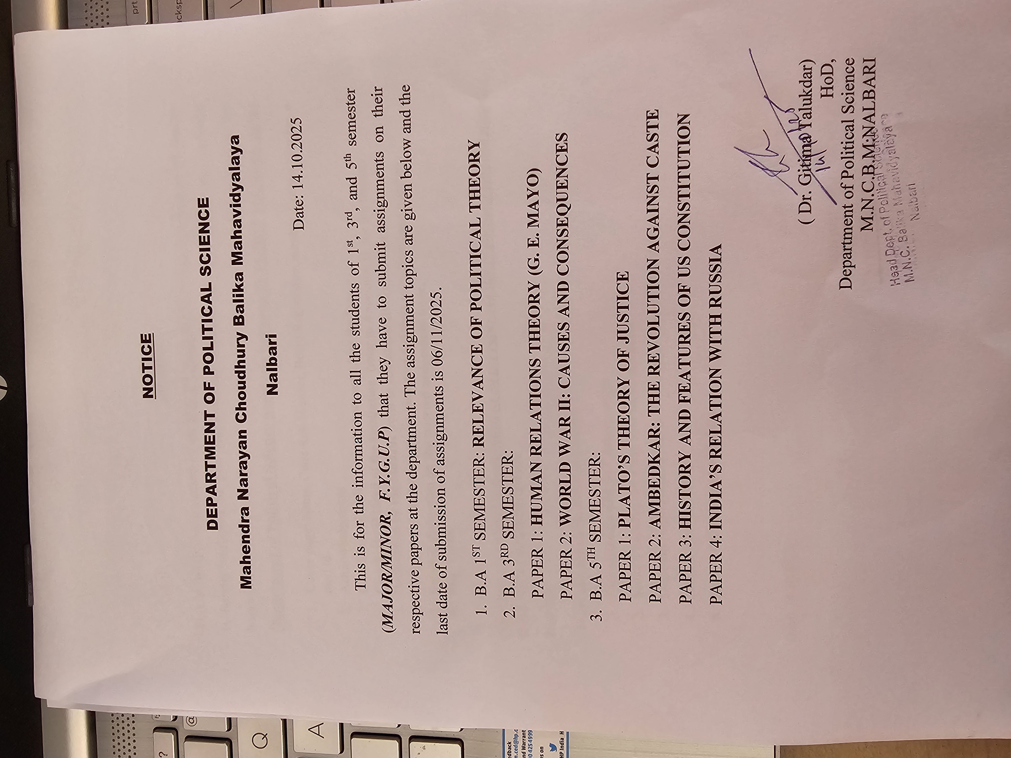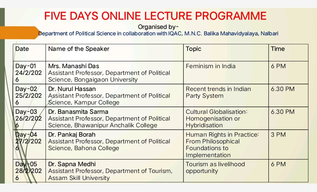 | 209 | Faculty Exchange Programme | The department of Political Science has organised faculty exchange program with the department of Political Science, Nalbari College on 16/11/2023 at MNC Balika Mahavidyalaya. | 2023-11-16 | View File |