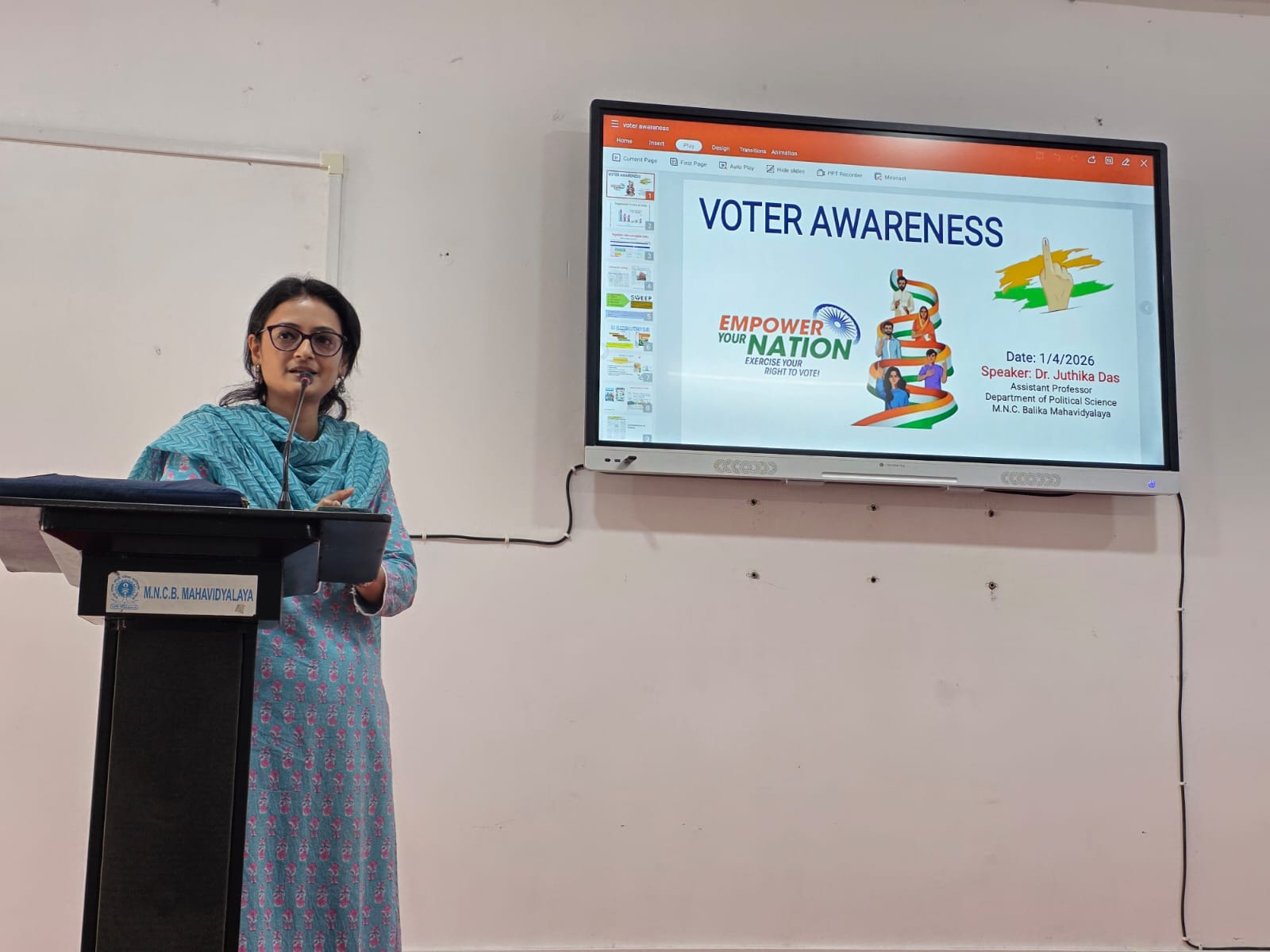 | 316 | Voter' Awareness Programme | The Dept. conducted a Voters’ Awareness Program on 1st April to promote electoral awareness among the new voters of our college. The initiative aimed to encourage our girls to participate in Election. | 2026-04-01 | View File |