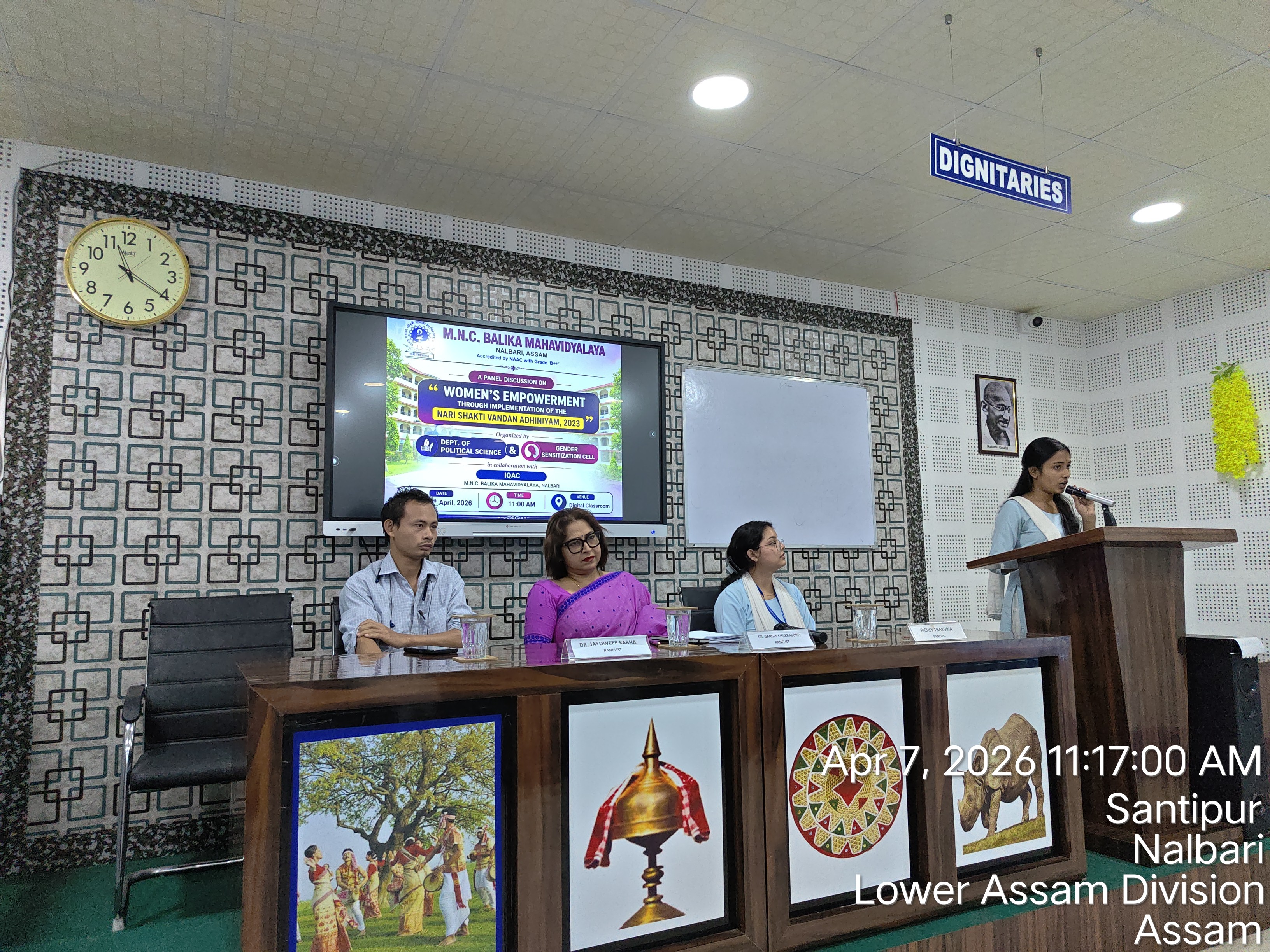 | 317 | A Panel Discussion on Women's Empowerment Through Implementation of the Nari Sakti Vandan Adhiniyam,2023 | The Dept. organised a panel discussion on the Nari Shakti Vandan Adhiniyam,2023.The session was graced by our respected Principal Maam, who, along with Joydweep Rabha and Richly Thakuria, panelists. | 2026-04-07 | View File |
