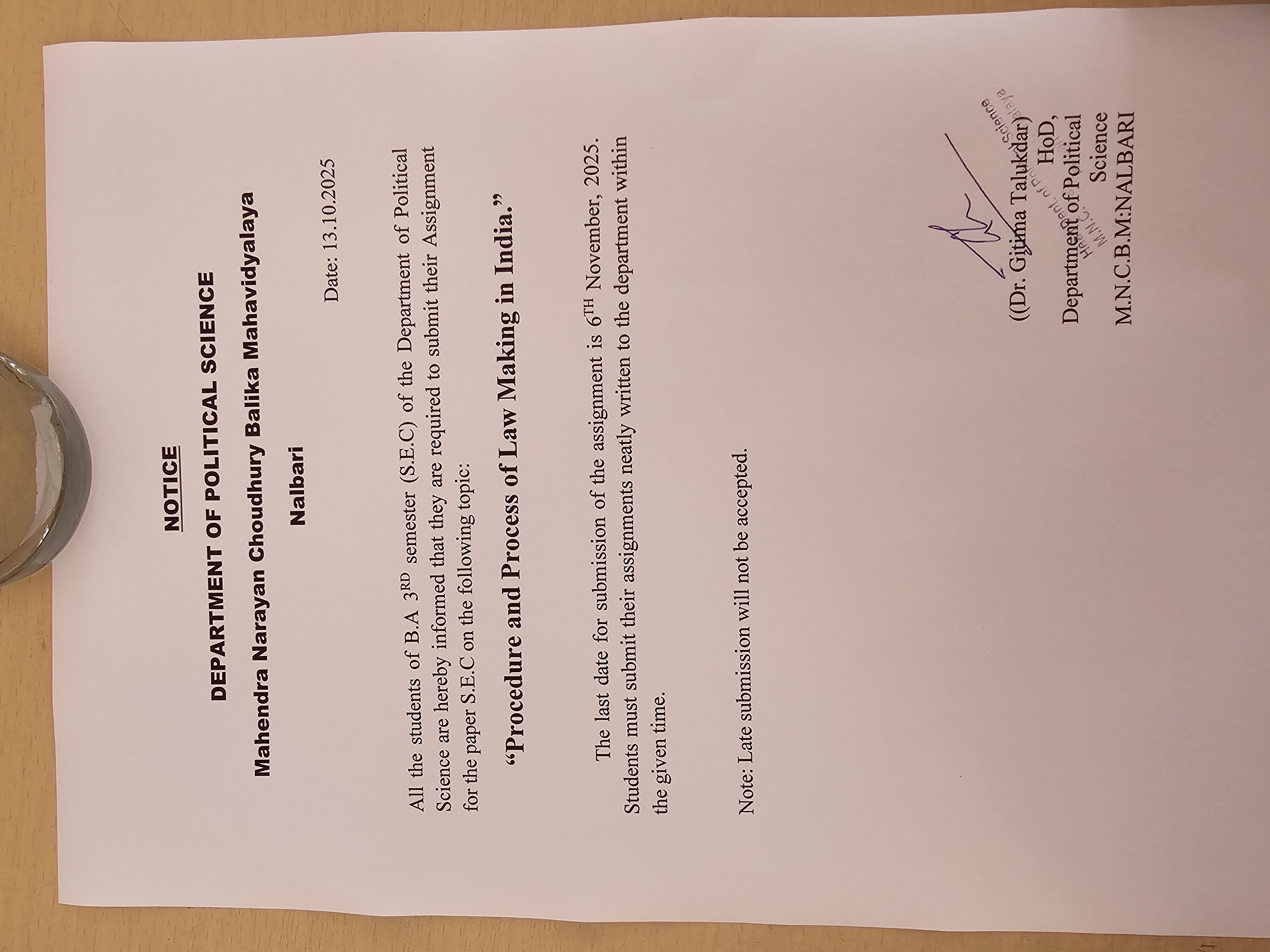 | 307 | Legal Camp organised by Nalbari Law college | The Law college has organised one legal camp in our department for the 5th Semester students | 2025-08-29 | View File |