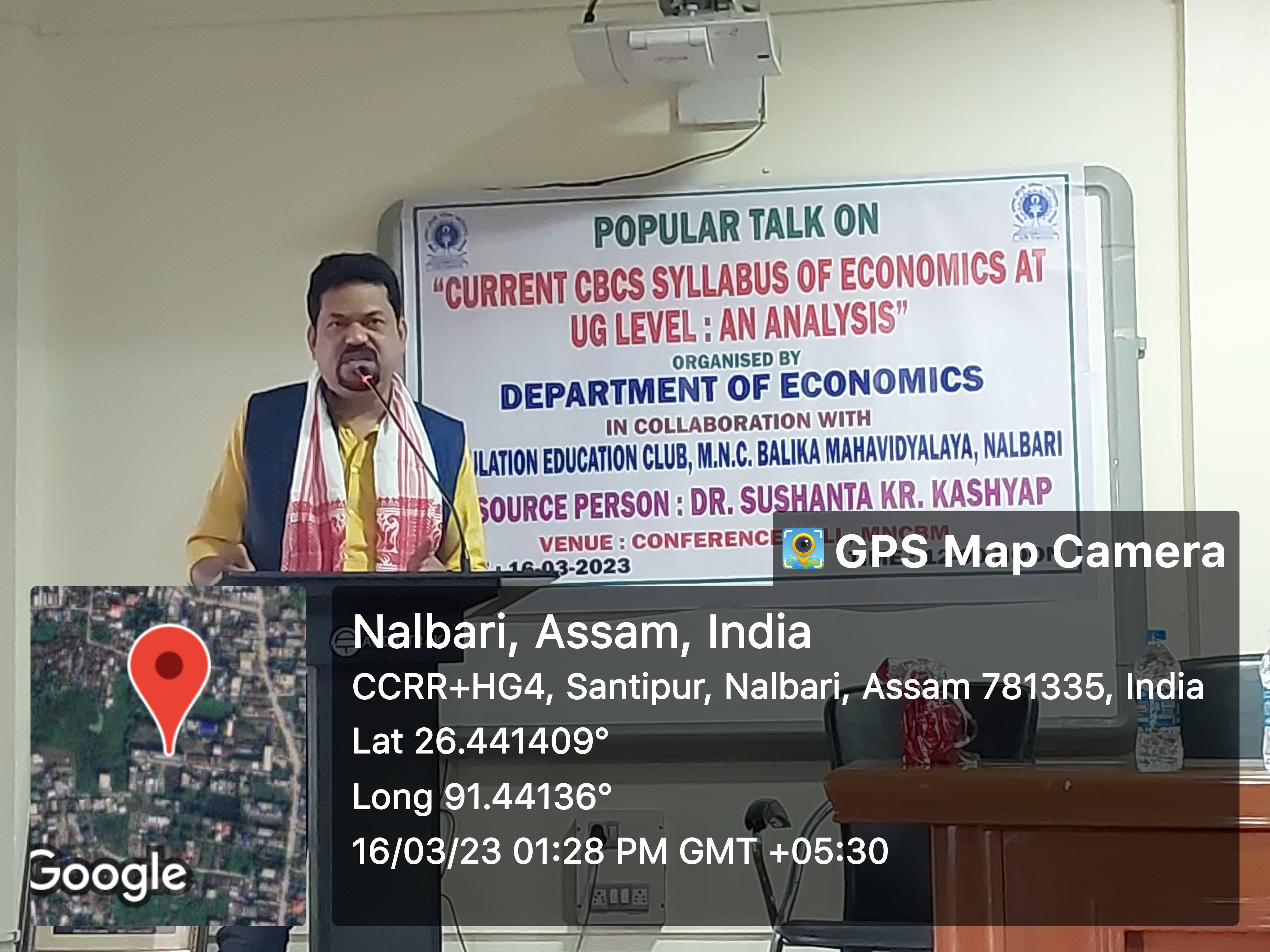 | 74 | Popular Talk "Current CBCS Syllabus of Economics at UG level: An Analysis" | Today a popular talk on "Current CBCS syllabus of Economics at UG level: An Analysis" is organized by Department of Economics in which Resource Person is Dr. Sushanta Kumar Kashyap | 2023-03-16 | View File |