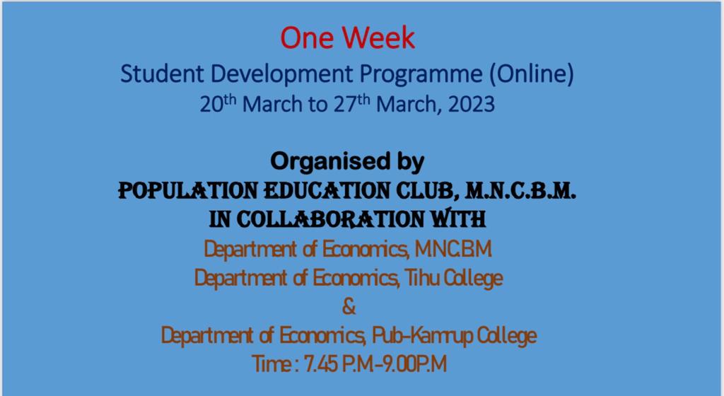 | 76 | Student Development Programme (SDP) from 20/03/2023 to 27/03/2023 | Department of Economics has conducted one week SDP through online mode. The Resource Persons are Dr. Suranjan Sarma,Dr. Khagen Das,Yeasmina Begum,Dr. Tiken Das,Anshuman Barua,Anupam Sarma & D.N.Sarma | 2023-03-20 | View File |