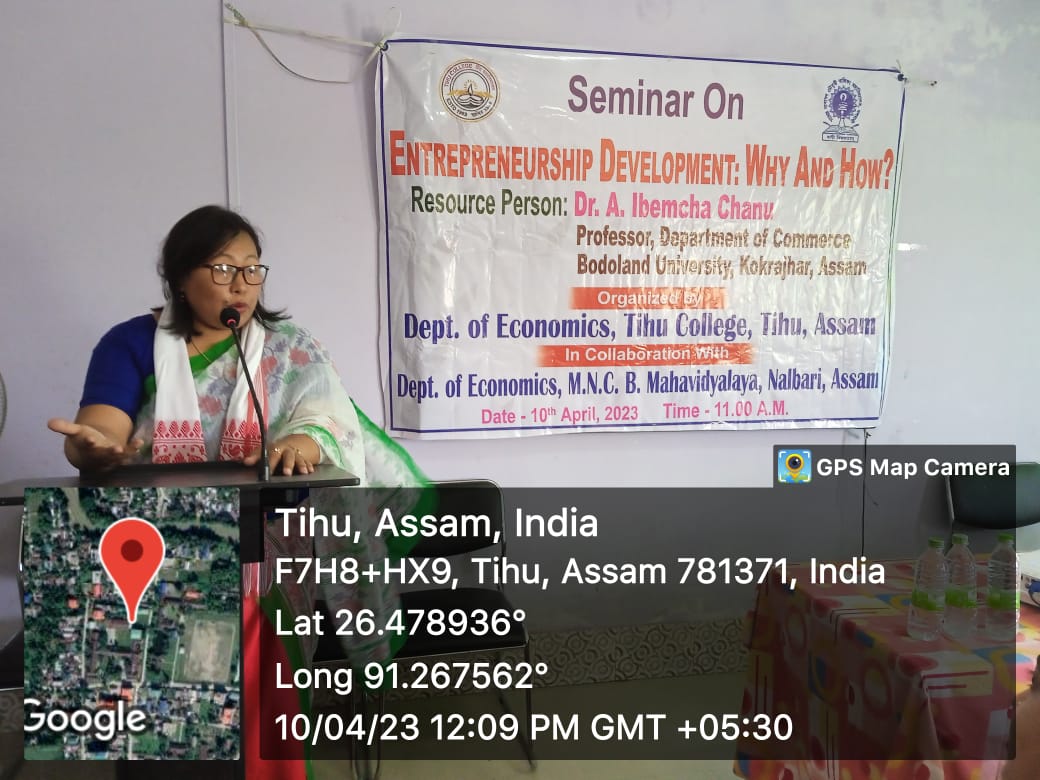 | 77 | One day Seminar on "Entrepreneurship Development: Why and How?" | Today Department of Economics, Tihu College in collaboration with Department of Economics, MNCBM organised a one day seminar in which Resource Person is Dr.A. Ibemcha Chanu,Department of Commerce,B.U. | 2023-04-10 | View File |