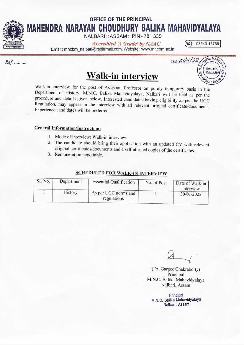 - Walk-in interview for the post of Assistant Professor, History Department. (Purely temporary basis) View