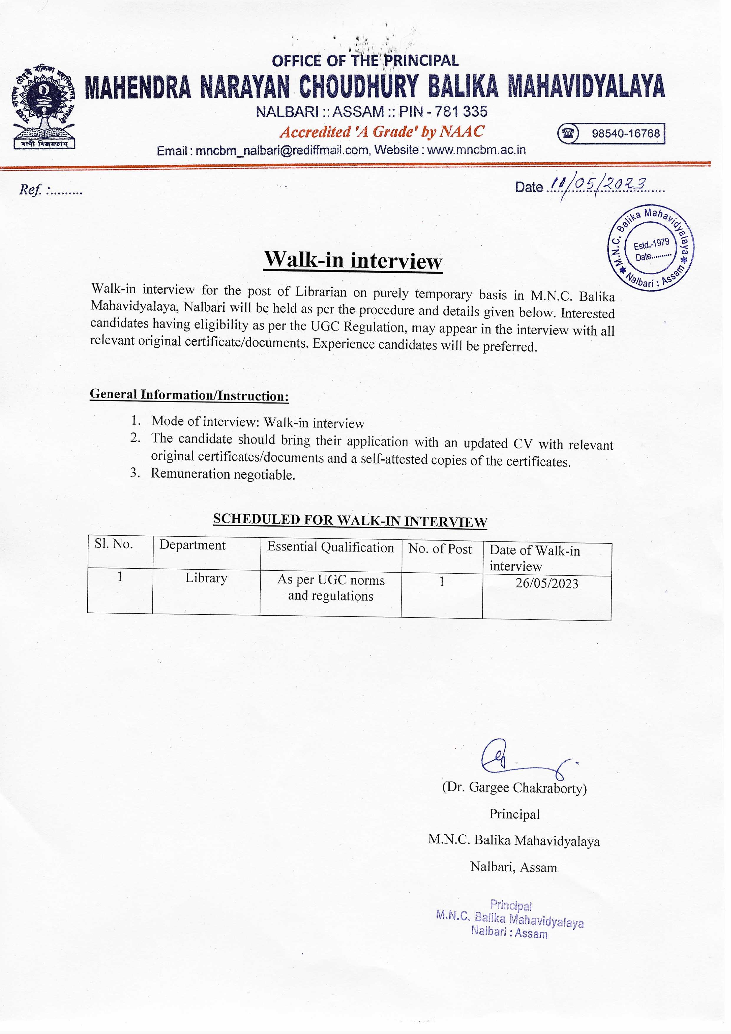 - Walk-in interview for the post of Librarian (Purely temporary basis) View