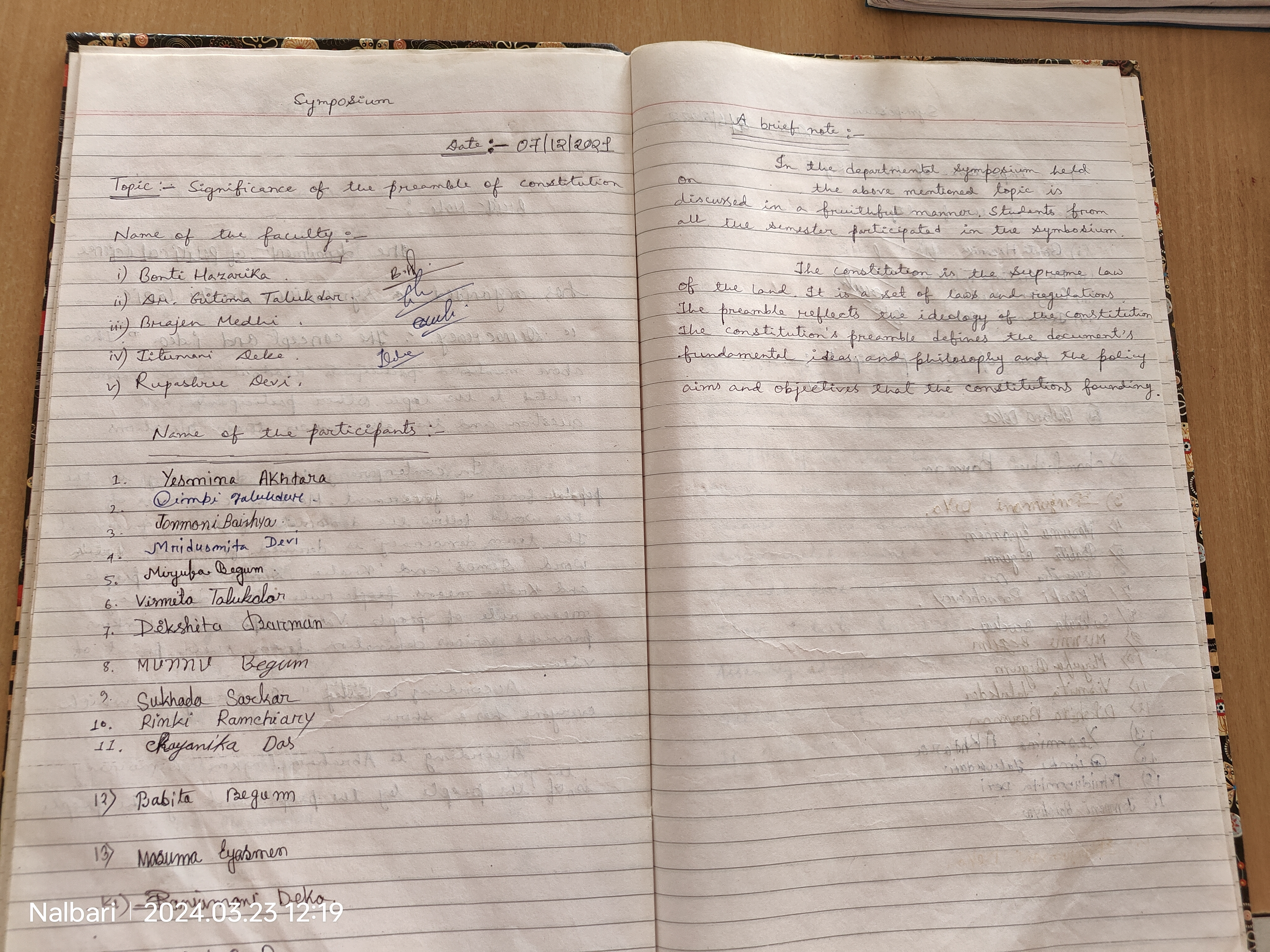 | 243 | Departmental Symposium | The Department has organised One day departmental Symposium on the topic Significance of the Preamble of the Constitution keeping in the view to develop basic knowledge of students about our preamble. | 2021-12-07 | View File |