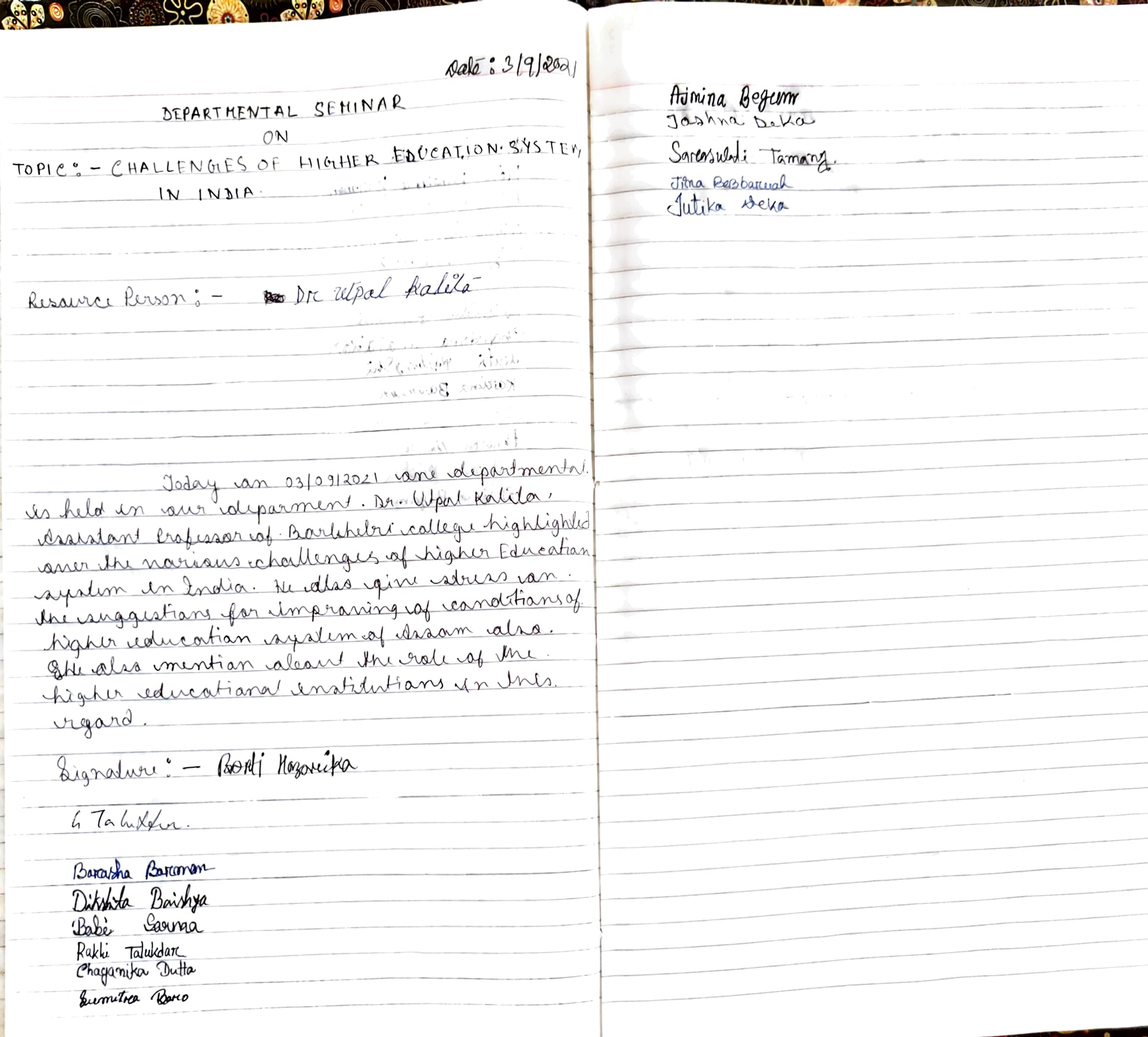 | 236 | Departmental Seminar | The department organised departmental seminar on the topic "Challenges of Higher education system in India". Dr Utpal Kalita, Assistant Professor, Barkhetri college invited as the resource person. | 2021-03-02 | View File |
