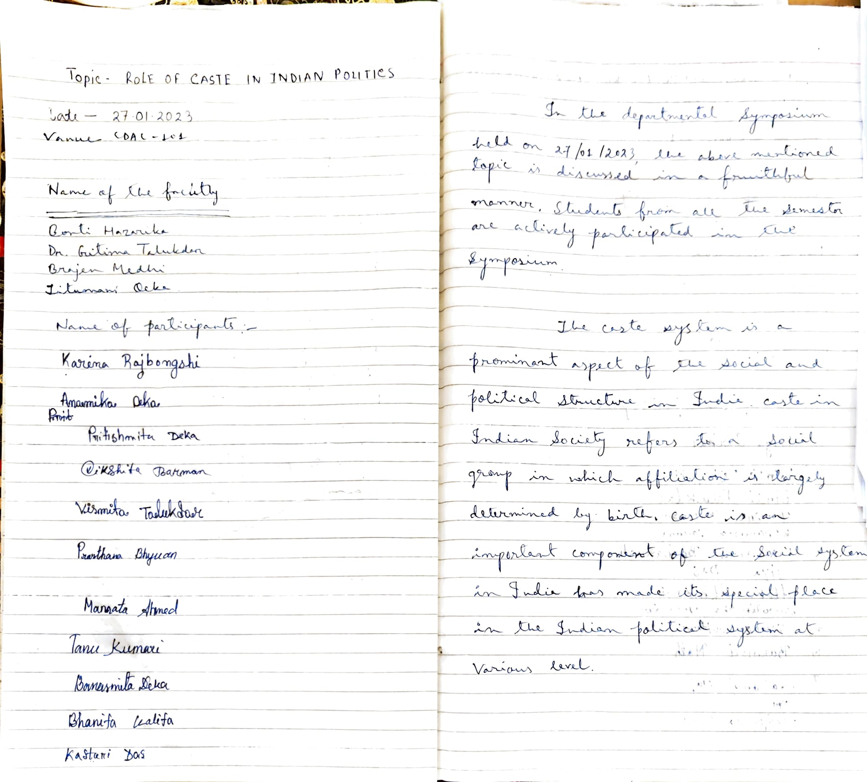 | 253 | Symposium | The department of Political Science organised symposium on " Role of Caste in Indian Politics" | 2023-01-27 | View File |