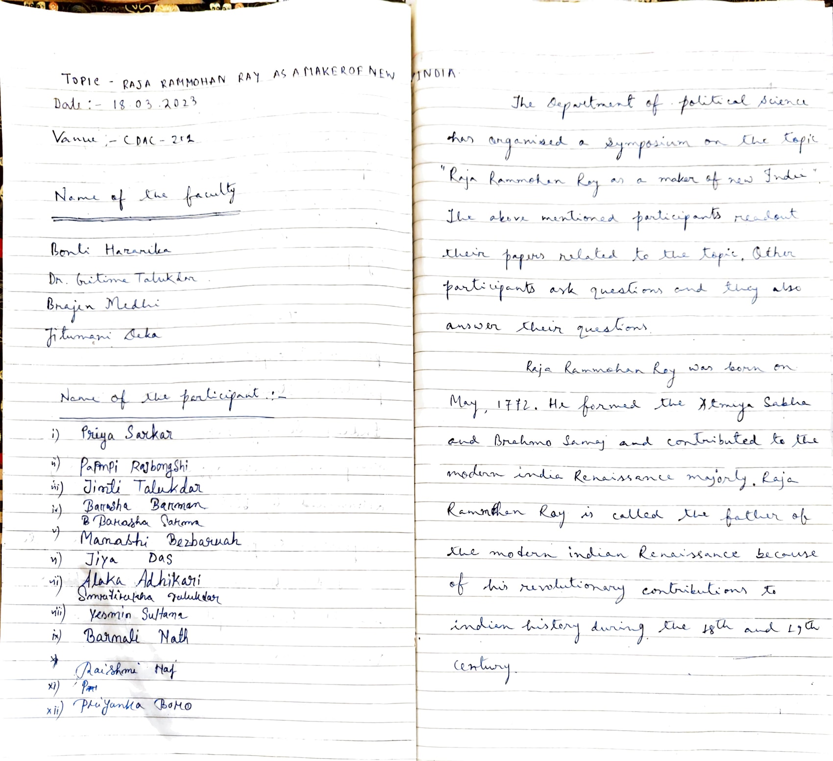 | 254 | Symposium | The department of Political Science organised symposium on " Raja Ram Mohan Roy : As a Maker of New India" | 2023-03-18 | View File |